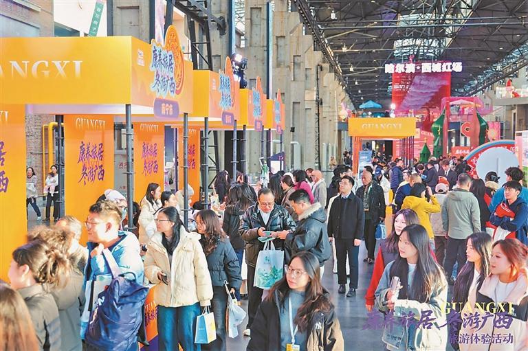 此次推介活动吸引了100多家桂黑两地旅游企业进行深度交流,并开展桂黑两地文旅企业产品对接会,达成多项合作。与推介会同步亮相的还有在哈尔滨红博西城红场举办的“康养旅居冬游广西”旅游体验活动,开展水果美食长桌宴、民俗竹竿舞、特色民俗表演等体验项目,现场人气火热,吸引了大量市民游客驻足打卡。现场设置多个特色主题展位,许多黑龙江省市民体验后,纷纷表示想到广西畅游山水、体验民俗、温暖过冬。